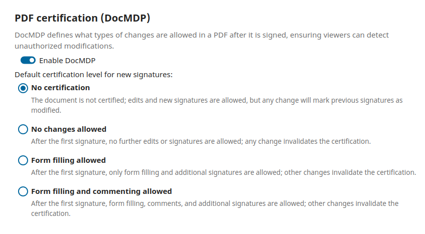 LibreSign now provides optional support for DocMDP (Document Management Policy), allowing administrators to define control policies for digitally signed documents.